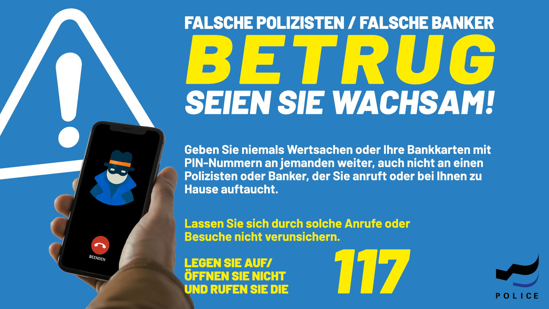 Aufgrund des anhaltenden Phänomens der falschen Polizisten / falsche Banker im Kanton, verbreitet die Kantonspolizei nochmals eine Präventionsbotschaft.